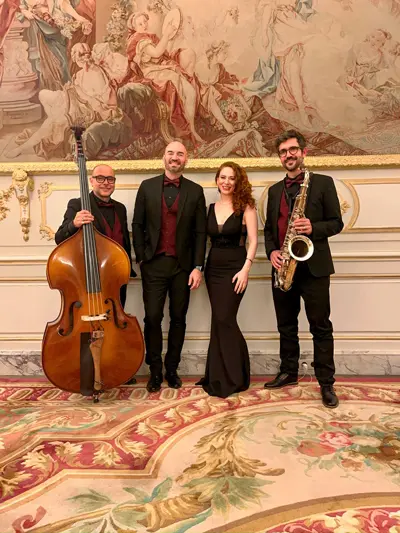 Pour ce cocktail et vin d’honneur, notre quartet (chant, piano, contrebasse, saxophone) a proposé un répertoire soigneusement choisi : standards de jazz, bossa nova, jazz-latin, chansons françaises et quelques classiques soul. Nous construisons une progression musicale — raffinée à l’accueil, puis plus vive lorsque la fête démarre — en veillant toujours à respecter le rythme du couple et de leurs invités.